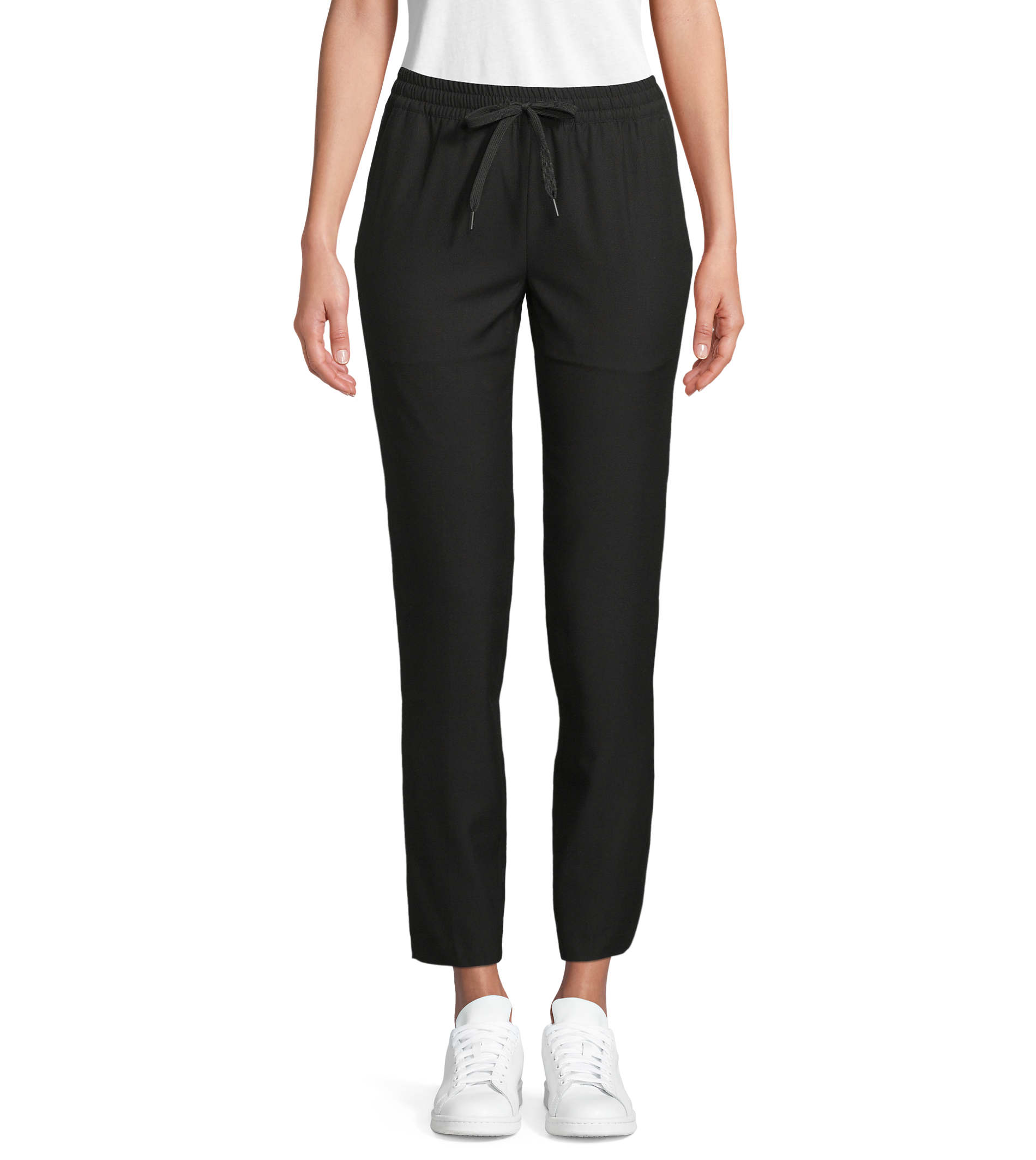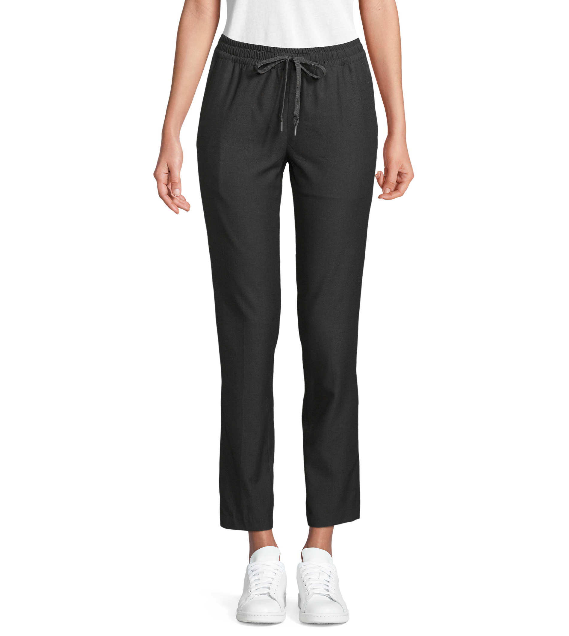 Cintura elástica Cordão de algodão plano com stoppers à cor Zip fly 2 bolsos frontais estilo italiano 2 bolsos traseiros debruados Corte fit, parte inferior ligeiramente ajustada