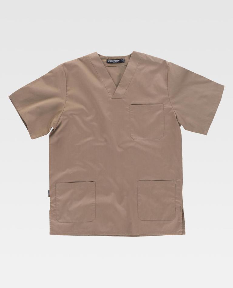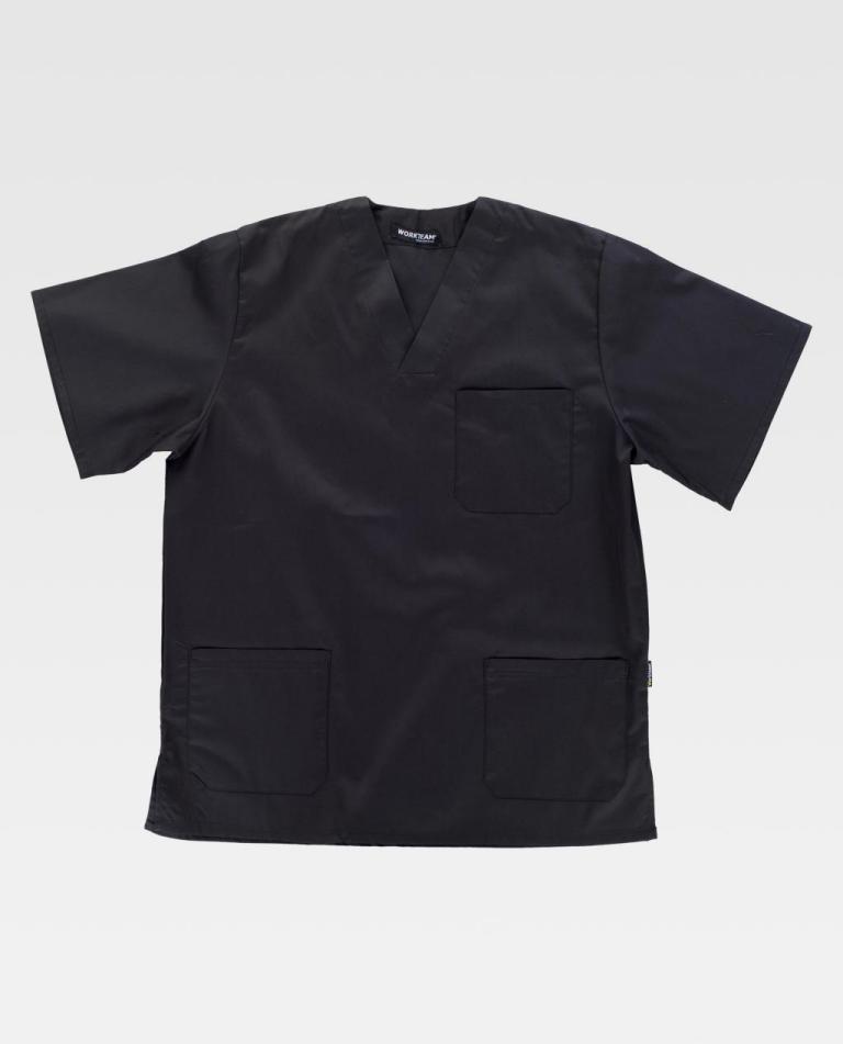 Túnica unissexo de manga curta e decote em bico cruzado.